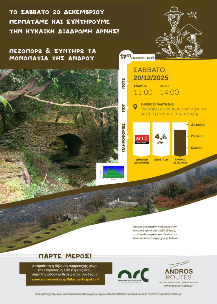 The post Το Σάββατο 20 Δεκεμβρίου περπατάμε την κυκλική διαδρομή Άρνης! appeared first on Andros Routes.